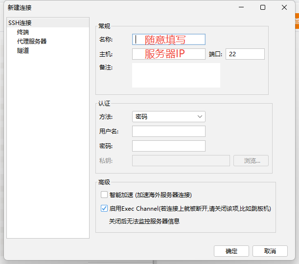 主机写你的服务器IP地址,端口一般无需修改(如果是NAT转发机请填写转发后的端口)