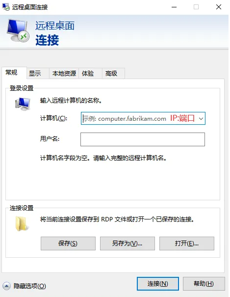 2、在“远程连接桌面”中,依次输入对应的服务器IP、端口、用户名,输入后点击连接